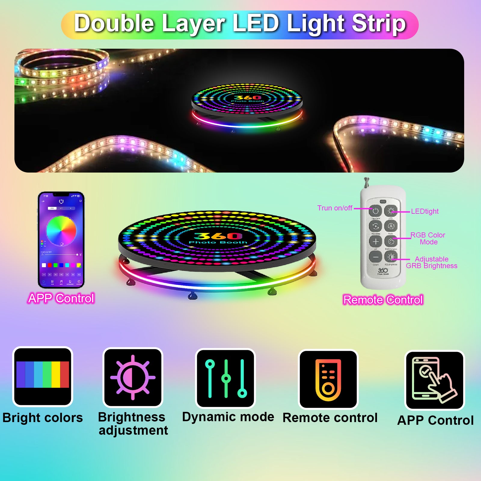 - 【APP/Handheld Remote Control】Two ways to control the machine,through the Button/APP , you can wirelessly control the speed of the 360 camera booth machine rotation, spin clockwise or counterclockwise.APP can also set the control time.The length and angle of the selfie stick can be adjusted as your needed. The selfie 360 rotating photo booth are also equipped with multicolor led strip light , sticker and other props to increase the sense of atmosphere.