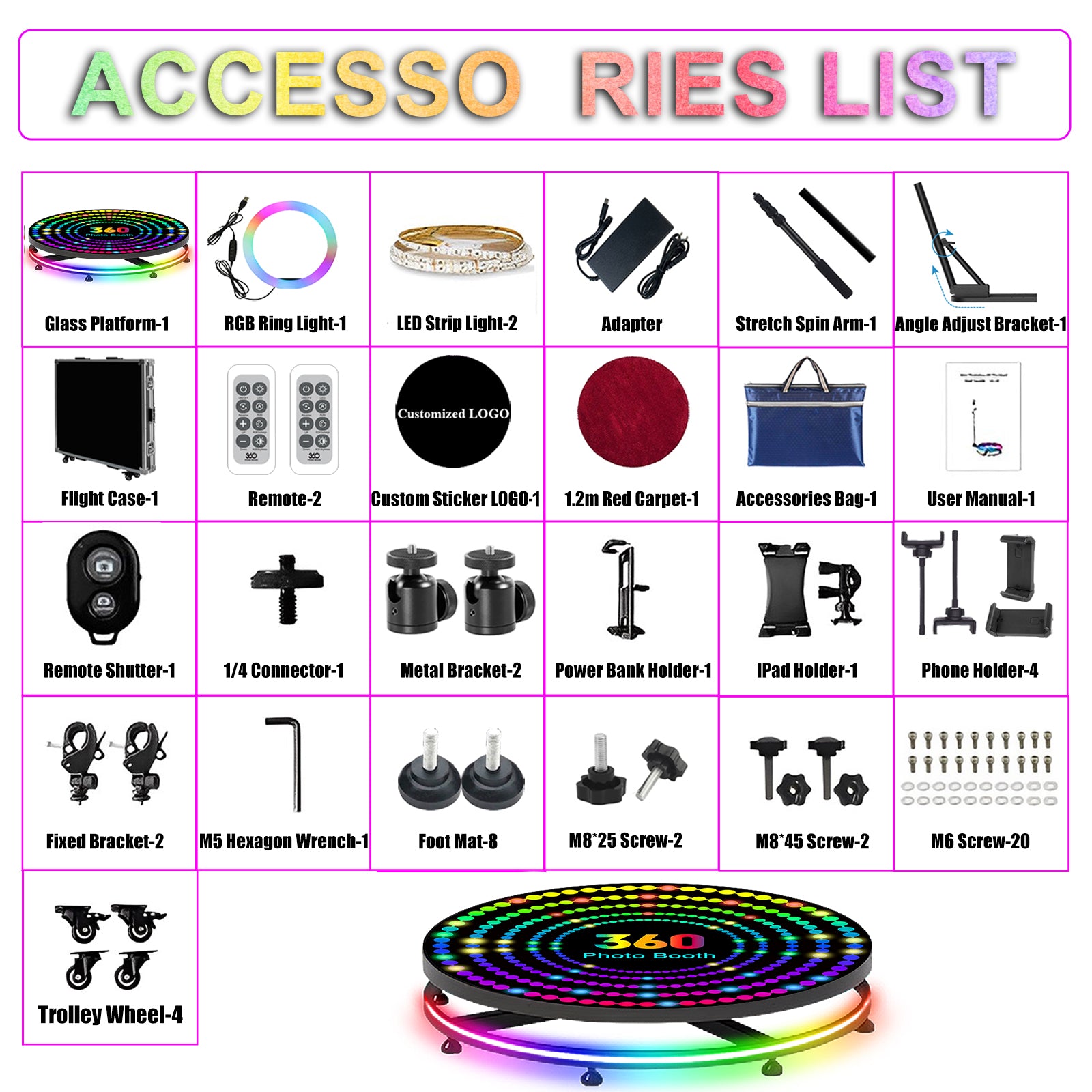 - 【Multi-size 360 Photo Booth Machine】The diameter 22‘’ suit for 1-2 people,the diameter 26.8" suit for 2-4 people to stand on,the diameter 31.5" suit for 3-5 people to stand,the diameter 39.4" suit for 4-6 people to stand,and the diameter 45.3" is suit for 5-7 people to stand.The flight case comes with 4 rollers(Install it yourself)