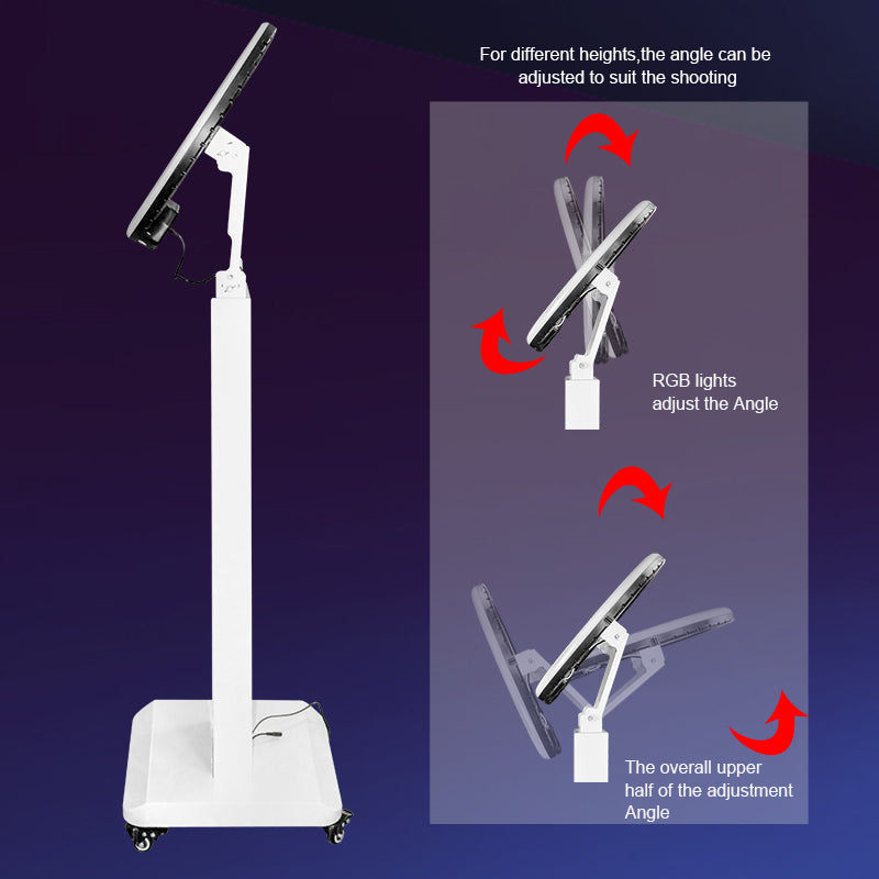 CONTROL PHOTO BOOTH RGB WITH RING LIGHT: This Portable Photo Booth is equipped with RGB ring light,you can adjust the color temperature and brightness(0%-100%) by the remote or APP control,And the angle of the ipad ring light is flexible and adjustable